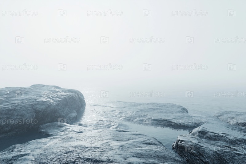 Скалистая береговая линия с видом на спокойный океан под мягким утренним туманом