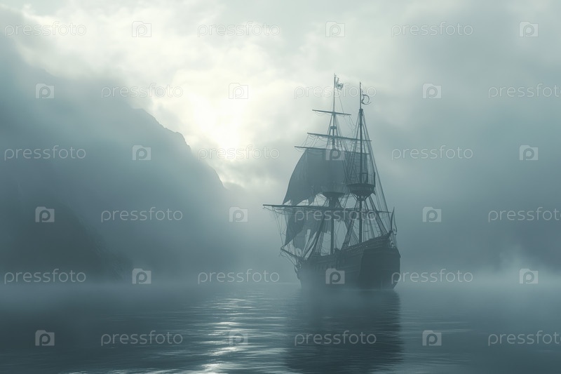 Парусный корабль, плавающий по туманной воде на восходе солнца в спокойной исторической сцене