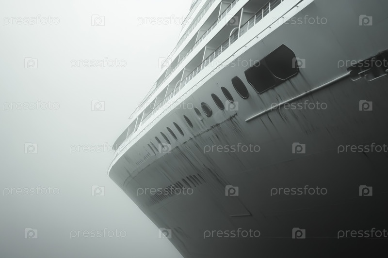 Круизный корабль Bow Emerging через плотный туман в минималистической морской сцене