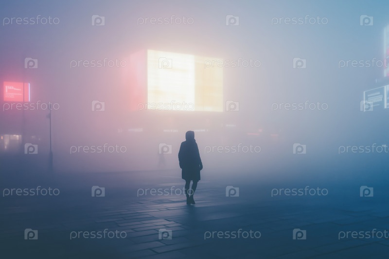 Силуэт молодой взрослой женщины, идущей в одиночку по туманной городской уличной ночи