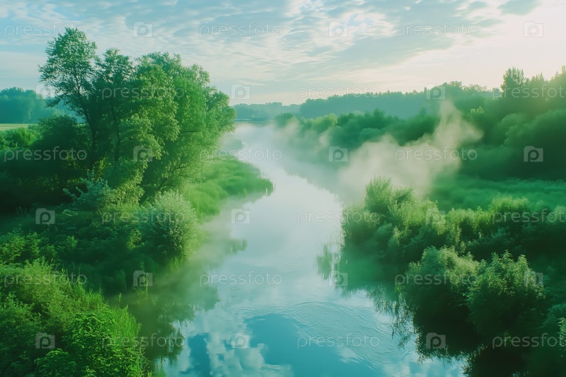 Туман, поднимающийся над ландшафтом пышной зеленой реки на рассвете
