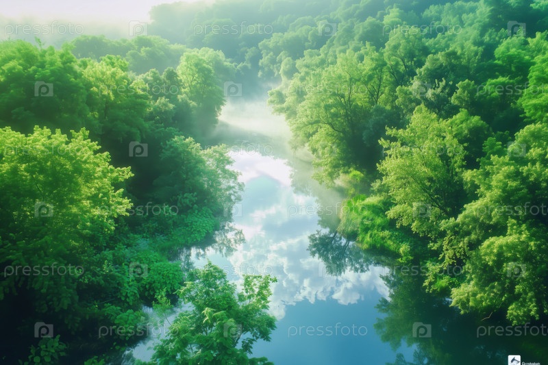 Плодородный зеленый лес окружает реку, отражая деревья и утренний туман