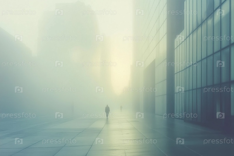Силуетированные мужчины среднего возраста, гуляющие по туманному городскому пейзажу на рассвете