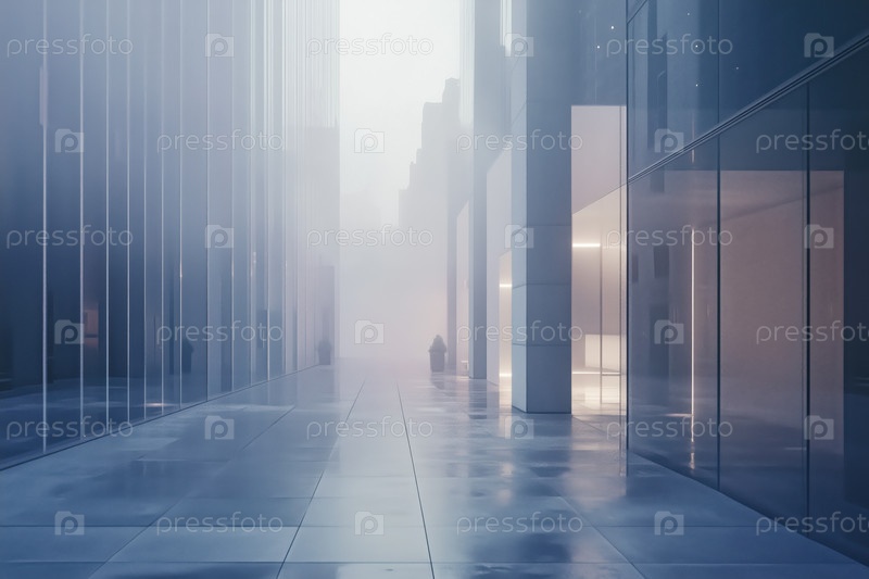 Одинокая фигура, идущая по современной городской аллее в утреннем тумане