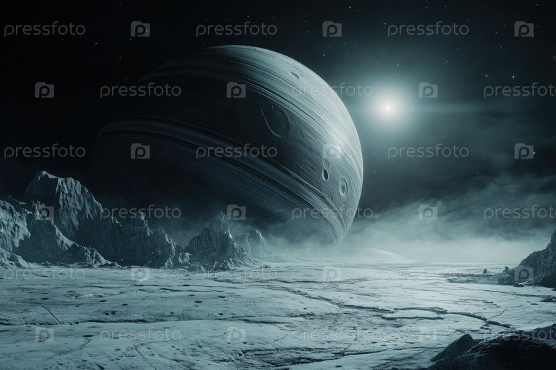 Удаленная газовая планета-гигант поднимается над ледяным инопланетным ландшафтом под звездным небом