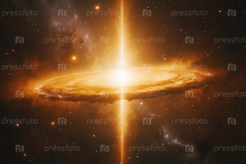 Яркое галактическое ядро излучает свет, окруженное вращающейся космической пылью