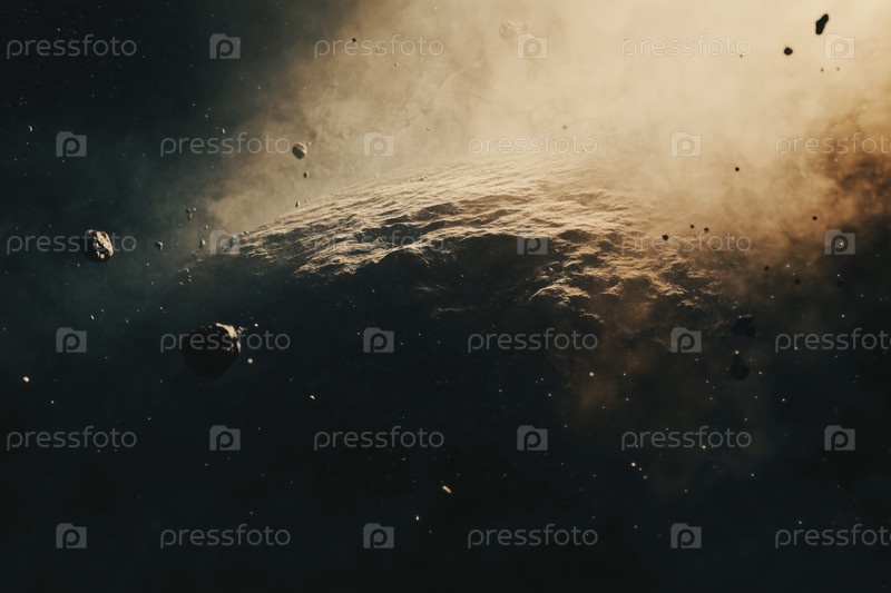 Астероиды, вращающиеся вокруг поверхности Скалистой планеты в космическом пространстве с сияющим солнечным светом