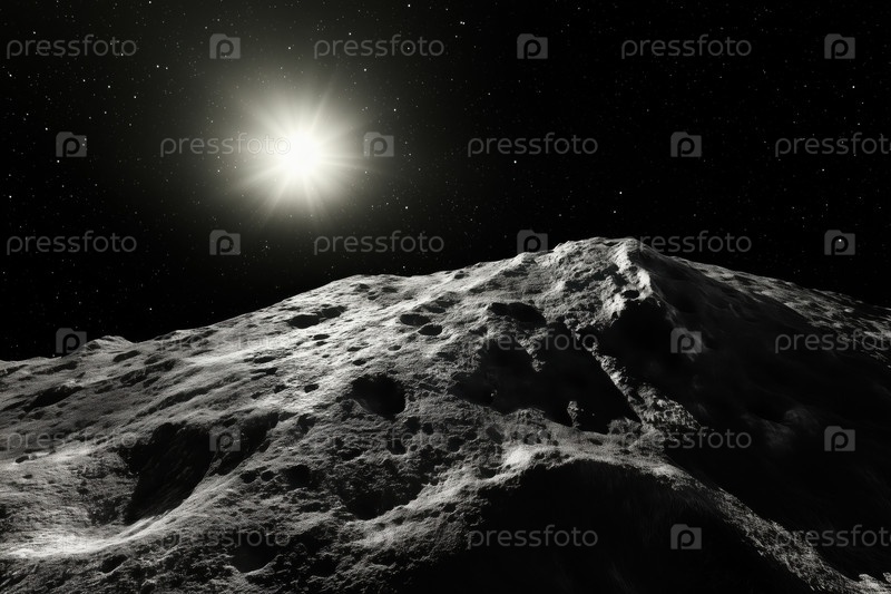 Скалистая лунная поверхность освещена солнечным светом в окружающей среде космического пространства