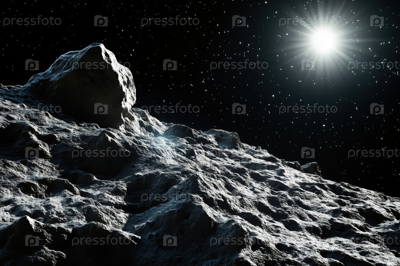 Поверхность Скалистого астероида, освещенная солнечным светом в окружающей среде космического пространства