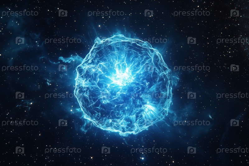 Яркая голубая энергетическая сфера излучает свет в глубоком космическом пространстве среди звезд