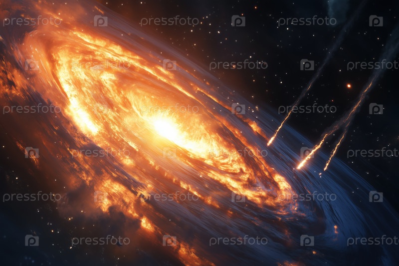 Спиральная галактика поглощает метеоры в глубоком космосе с светящимся огненным ядром
