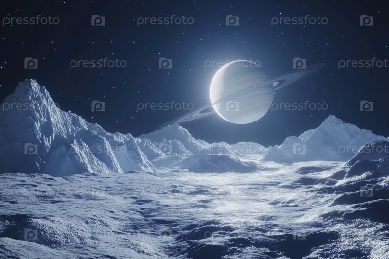 Ледяной горный пейзаж под звездным небом с Сатурном, восходящим на расстоянии