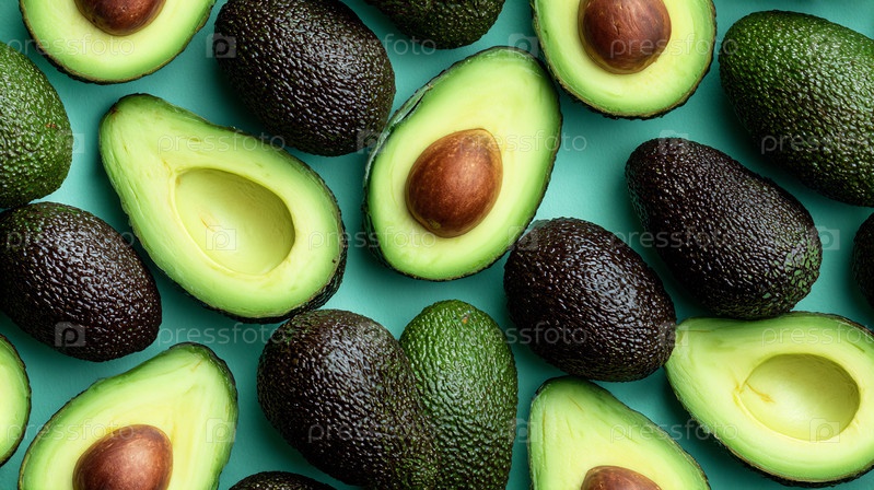 Плоская кладовая из свежих, созревших целых и наполовину сложенных авокадо на ярко-тиркузовом фоне. бесшовные плитки