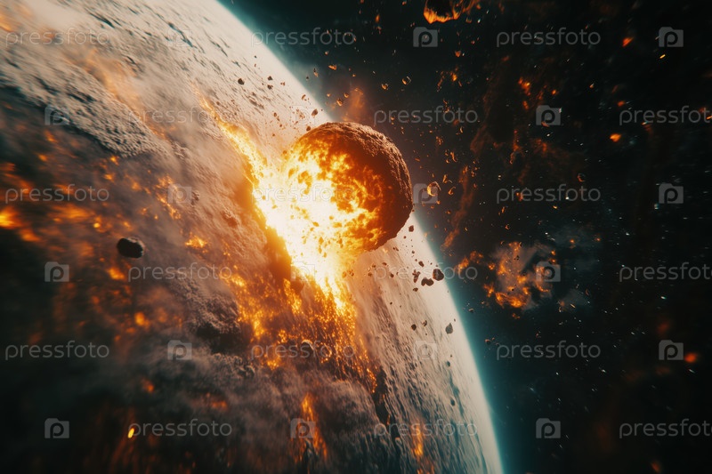 Астероид поражает Землю, создавая мощный взрыв и огненное облако обломков