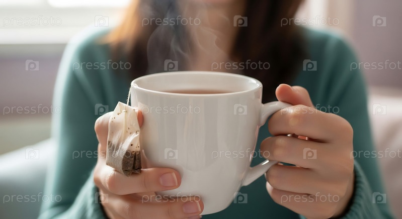 Женщина держит высокую кружку уже заваритого горячего чая своими руками