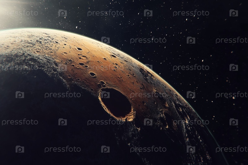 Дальний вид поверхности планеты с большим кратером в космическом пространстве