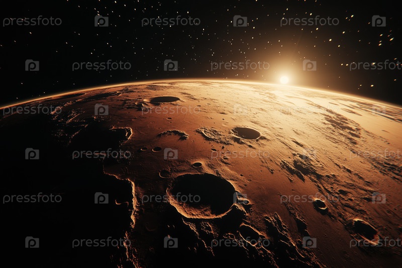 Солнце восходит над марсианской поверхностью с кратерами и далеким звездным полем