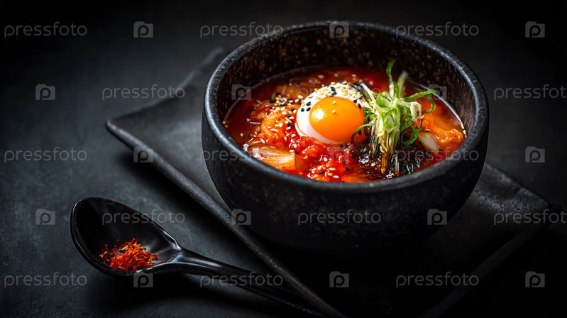 Острый рамен или кимчи джигае с яйцами и свежими травами, темный фон