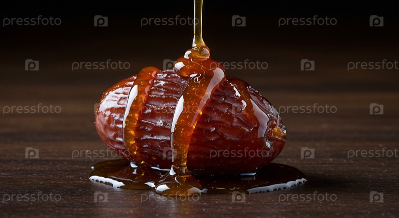 Ближайший снимок золотого меда, ожидающего свежих фруктов на темном деревянном столе