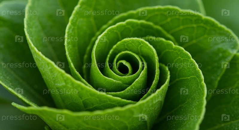 Подробный вид свежих зеленых листьев, разворачивающихся в спиральной форме