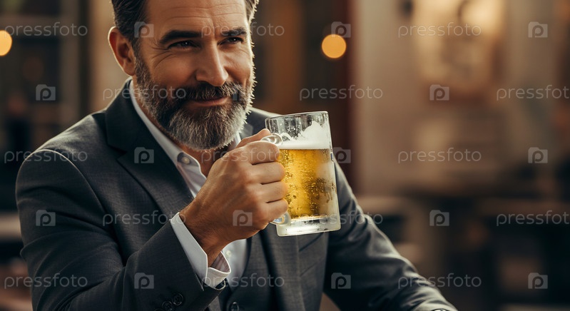 Веселый бородатый мужчина в костюме наслаждается освежающим пивом