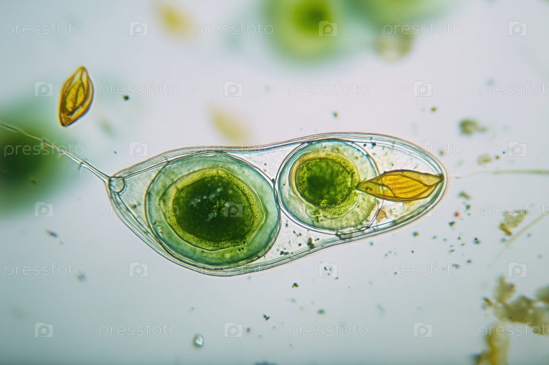 Близкий взгляд на клетки зеленых водорослей под микроскопом, показывающий клеточную структуру