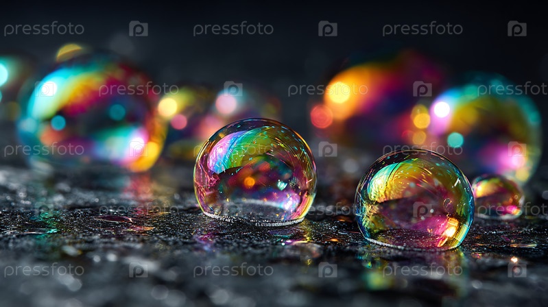 Яркие мыльные пузыри, отражающие спектр цветов на темной поверхности