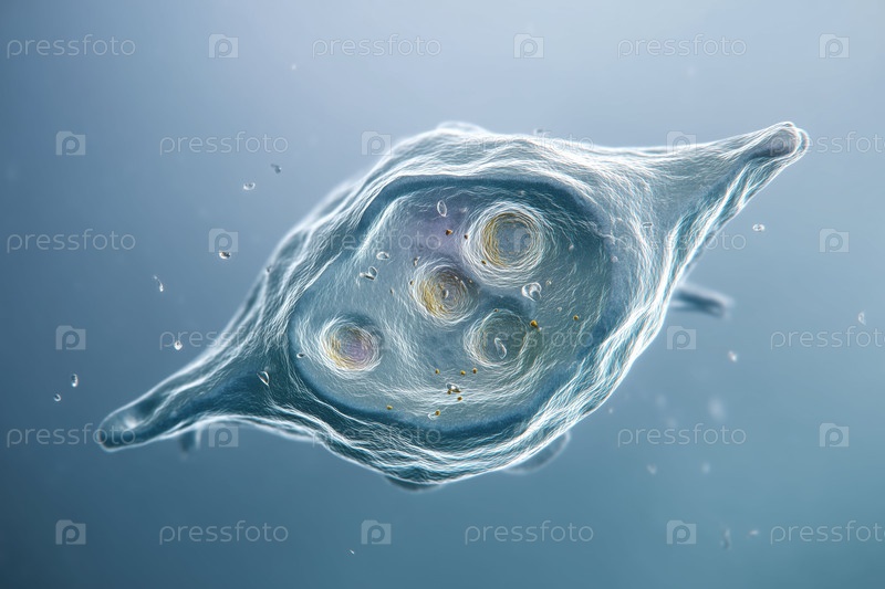Микроскопический одноклеточный организм, плавающий в воде под увеличением