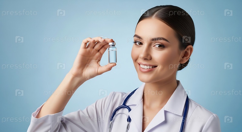 Улыбающийся врач держит бутылку медицинской вакцины