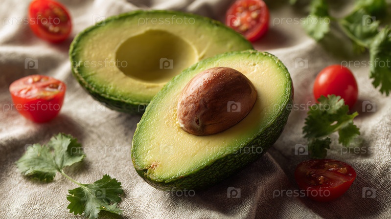Свежее авокадо наполовину с помидорами и травами