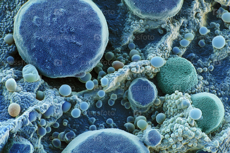Микроскопический взгляд, показывающий клеточные структуры и органеллы в биологической ткани
