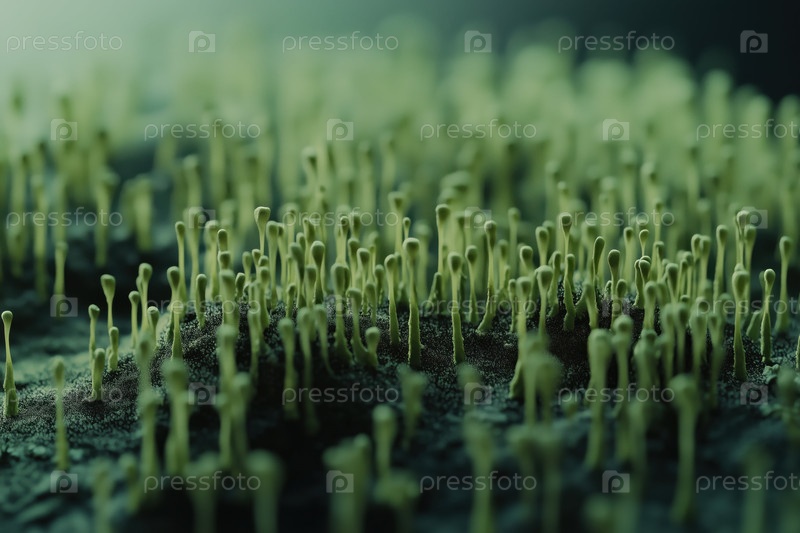 Ближайшее изображение зеленых споров плесени, растущих на поверхности в влажной среде