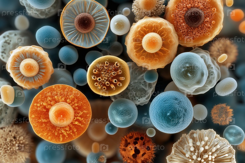Красочные микроорганизмы плавают и взаимодействуют в абстрактном научном контексте
