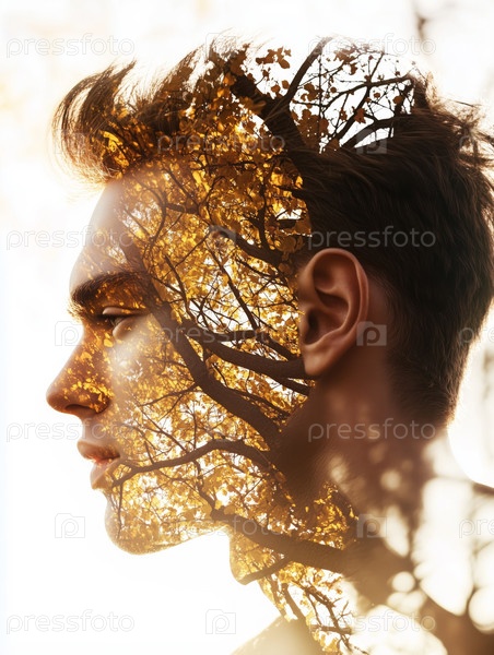 Молодой человек созерцает природу в осенней сцене двойной экспозиции