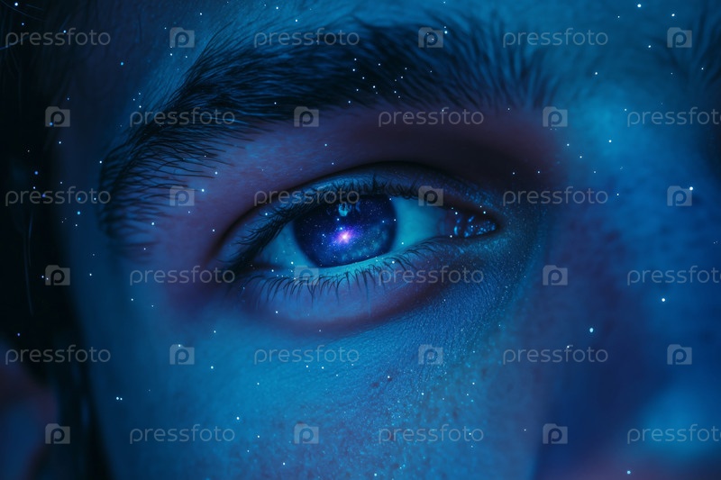 Портрет молодого взрослого мужчины, глядящего на Галактику, отраженную в глазах
