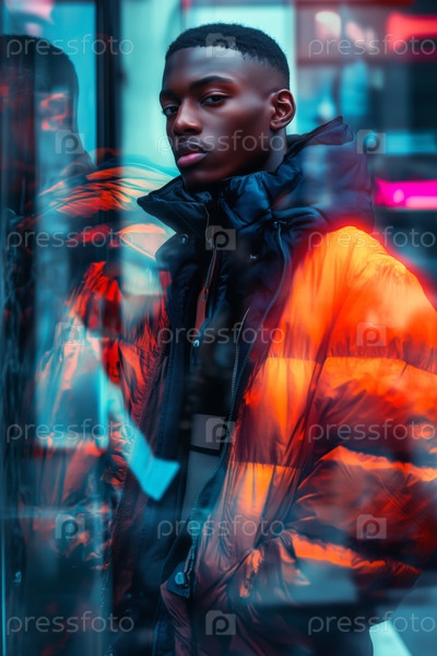 Портрет молодого взрослого чернокожего мужчины, стоящего в городской обстановке с двойной экспозицией