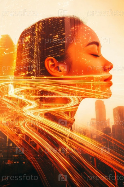 Молодая азиатская женщина медитирует с двойной экспозицией городского пейзажа и световых троп
