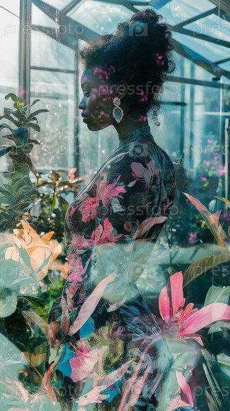 Молодая взрослая чернокожая женщина стоит среди растений в художественной двойной экспозиции