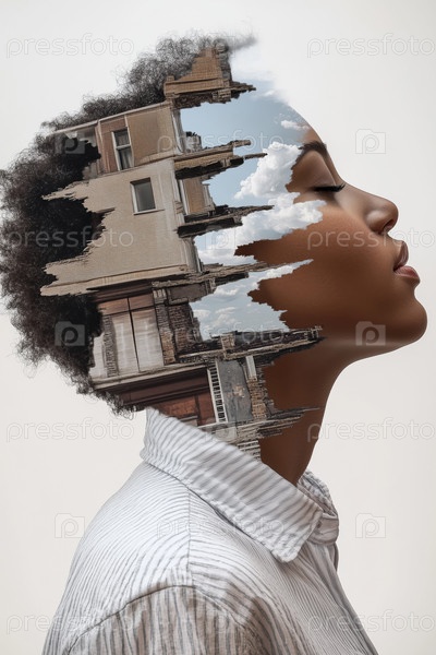 Молодая взрослая чернокожая женщина, мечтающая об городской архитектуре Эффект двойного воздействия