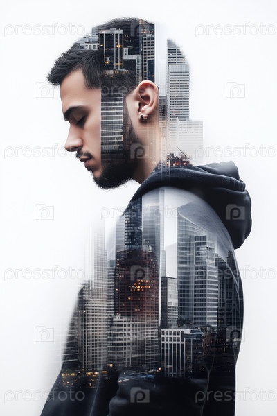 Молодой взрослый мужчина, стоящий в двойной экспозиции с городским ландшафтом