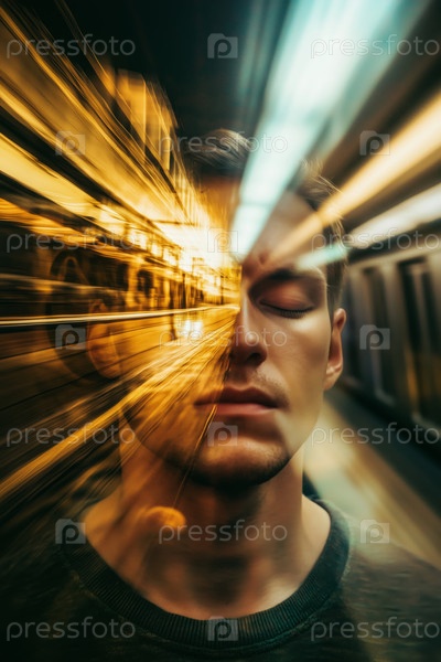 Молодой взрослый мужчина стоит с закрытыми глазами в эффекте двойной экспозиции