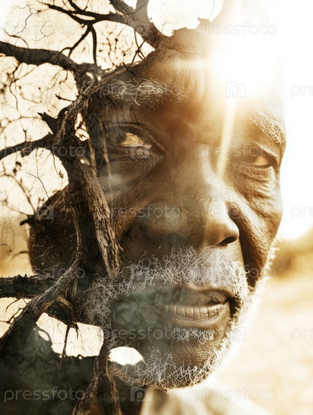 Портрет старшего чернокожего мужчины, смешивающегося с ветками деревьев в двойной экспозиции