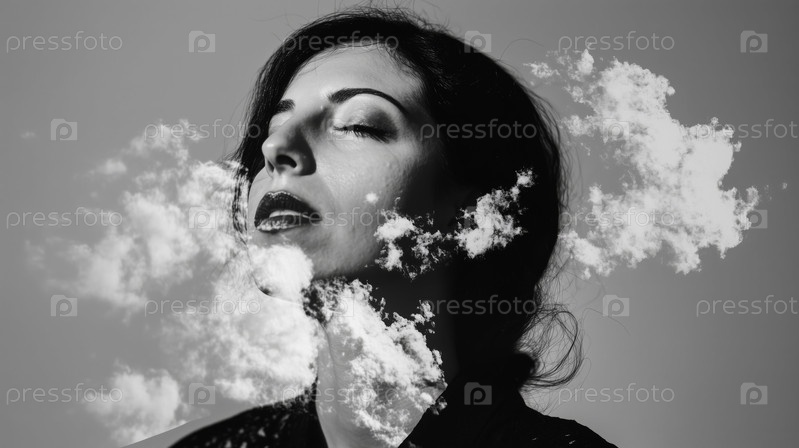 Молодая взрослая женщина отдыхает с закрытыми глазами в облаках двойной экспозиции