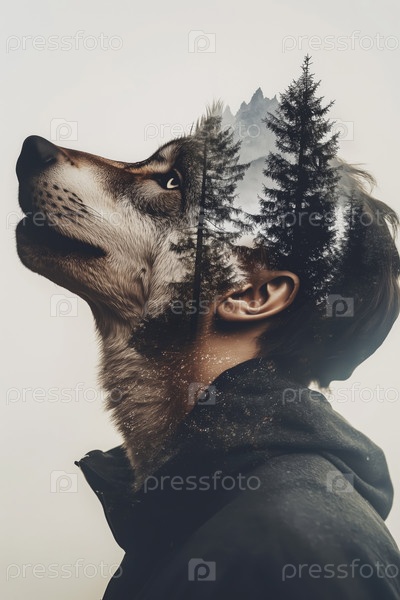 Двойная экспозиция силуэта молодого человека и волка, смешивающегося с лесом