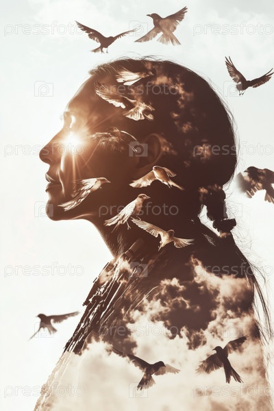 Профиль молодой взрослой женщины, созерцающей птиц и облака