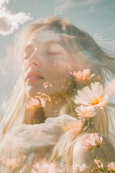 Молодая женщина отдыхает на открытом воздухе с двойным воздействием цветов и неба