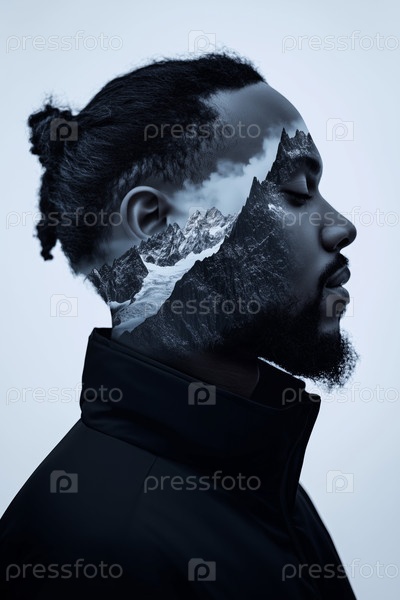 Молодой взрослый чернокожий мужчина размышляет с двойной экспозицией горного пейзажа