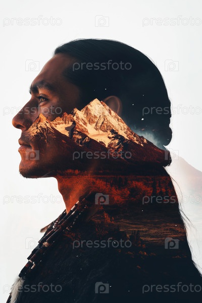 Молодой взрослый индейский мужчина созерцает природу в двойной экспозиции Горная сцена