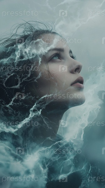 Портрет молодой женщины, смотрящей вверх с эффектом двойной экспозиции