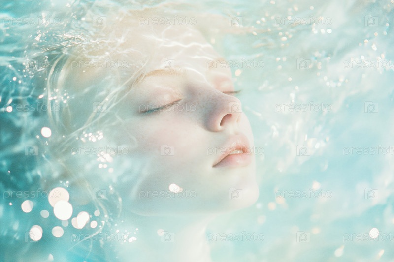 Молодая женщина плавает под водой с закрытыми глазами при двойной экспозиции